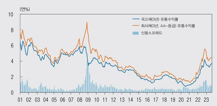신용스프레드란 특정 채권의 수익률과 무위험 채권인 동일한 만기의 국고채의 수익률 간 차이입니다. 신용스프레드는 개별 채권의 신용위험을 나타내는 대표적인 지표로 활용되고 있습니다. 회사채는 발행회사가 부도가 날 경우 원리금의 일부 혹은 전부를 상환 받지 못할 위험이 있기 때문에 국채에 비해 수익률 이 더 높은 것이 일반적입니다. 통상 신용스프레드는 기업의 재무건전성과 현금창출능력을 나타내는 수익성 등에 따라 달라지며, 특정 회사채의 신용스프레드가 높다는 것은 향후 그 기업의 수익성 및 성장성 등에 대한 우려로 투자자들이 보다 낮은 가격(높은 이자율)에서 그 회사채를 매입하려는 것이며, 그 만큼 해당 기업의 자금 조달 여건이 높은 이자율로 인해 좋지 못함을 의미합니다. 또한, 신용스프레드는 국내외 금융시장 변동성 확대 또는 기업 구조조정 이슈 등으로 개별기업 파산의 우려가 커지거나 회사채 시장의 유동성이 악화되는 경우에도 확대될 수 있습니다. 아래 그림에 서 볼 수 있듯이 우리나라의 신용스프레드는 2000년대 이후 꾸준히 축소되다가 2008년 글로벌 금융위기를 맞이하여 크게 확대되었습니다. 이후 대체로 축소세를 보이는 가운데 2013년 중견 대기업(웅진, 동양, STX) 부실화 및 2015년 하반기 조선·해운 등 취약업종 구조조정 시기, 2020년 코로나19 사태, 2022년 부동산 PF관련 CP·채권시장 불안 시기 등에 확대되는 모습을 보이고 있습니다.