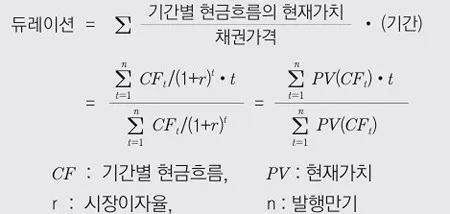 듀레이션이란 채권에서 발생하는 현금흐름을 기준으로 가중평균한 만기를 의미합니다. 듀레이 션은 채권의 현금흐름 발생 기간(t)에 각 시점 현금흐름의 현재가치가 채권가격에서 차지하는 비중을 가중치로 곱하여 산출하며 이는 채권투자액의 현재가치 1원이 회수되는 데 걸리는 평균회수기간을 의미합니다. 채권의 발행만기는 최종 원금지급 시점을 나타내는데 비해 듀레이션은 만기 이전에 발생하는 모든 현금흐름을 감안한 평균회수기간이기 때문에 만기 이전에 현금흐름이 발생하는 이표채권의 듀레이션은 항상 채권의 발행만기보다 짧게 산출되는 특징을 가지고 있습니다.