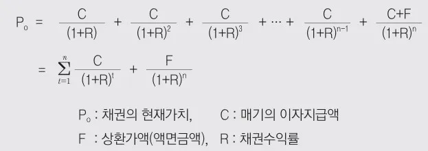 채권수익률은 채권 투자 시작부터 만기까지 얻게 되는 현금흐름의 현재가치와 채권의 시장가 격을 일치시켜주는 할인율(YTM: Yield To Maturity)을 의미합니다. 가령, 액면금액을 만기에 지급하고 일정 기간마다 채권표면에 제시된 이율에 따라 이자를 지급하는 채권인 이표채권의 현재 가격이 Po이고 매기 C의 이자를 받고 n기 후에 액면가액 F를 상환 받을 경우 그 채권의 수익률은 아래 식을 만족시키는 R입니다.