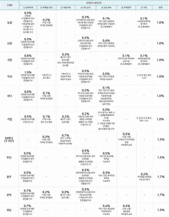 청년도약계좌 은행별 우대금리 세부항목 비교표