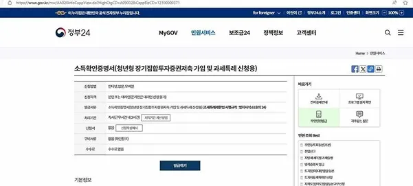 소득확인증명서(청년형 장기집합투자증권저축 가입 및 과세특례 신청용) | 민원안내 및 신청 | 정부24 (gov.kr)