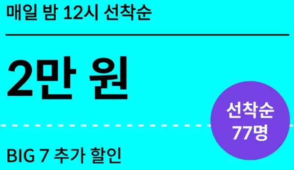 - 혜택2 : BIG 7 런칭기념 더블 할인 매일 77명 BIG 7 추가 할인 2만원