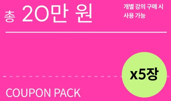 - 혜택3 : 평생시청 강의 1개만 사도 최대 8만원 즉시할인(쿠폰 팩 20만원)