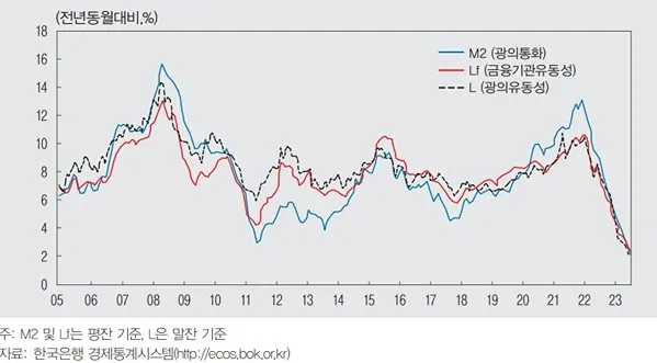 2008년 글로벌 금융위기 이전까지는 견조한 실물경제 성장률, 대외자금의 꾸준한 유입 및 부동산시장의 호황 등을 바탕으로 M2(광의통화)의 증가세가 확대되었습니다. 그러나 금융위기 이후 2013년까지는 경기성장세 둔화 및 부동산시장의 약세 등으로 지속적으로 낮아지다가 2014년 이후부터 2019년까지는 대체로 2000년대 중반 수준인 연 7% 증가율 수준을 보이고 있습니다. 그리고 코로나19 확산 시기에는 위기에 대응한 완화적 통화정책 등으로 M2 증가세가 확대 되었다가, 2021년 하반기 이후로는 물가 안정에 중점을 둔 긴축적 통화정책 기조가 유지됨에 따라 둔화 흐름이 지속되었습니다.