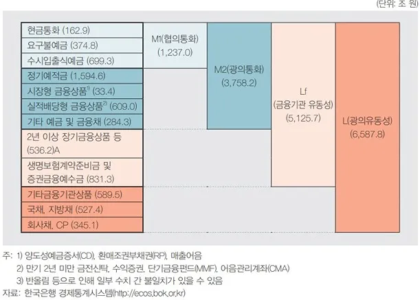 우리나라는 M1(협의통화), M2(광의통화), Lf(금융기관유동성)를 매월 편제하고 있으며 2006년 6월부터는 L(광의유동성)을 작성하여 발표하고 있습니다.