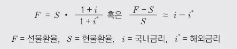 선물환율(forward exchange rate)은 외환의 매매계약 체결일로부터 2영업일을 초과한 장래의 특정일에 결제가 이루어지는 환율을 의미합니다. 이론적으로 선물환율은 금리평가이론(covered interest rate parity)에 따라 두 통화 간의 금리 차이에 의해 결정되며, 그 산식은 다음과 같습니다.
