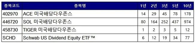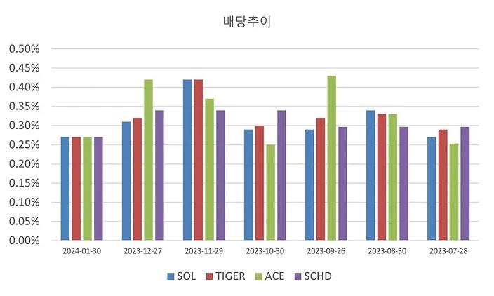 TIGER 미국배당다우존스(458730)가 상장일이 2023-06-20 이기 때문에 이후의 배당수익률을 비교하였습니다. SOL과 Tiger는 월배당으로 출시된 상품이며, ACE의 경우 23년 중순부터 분기배당에서 월배당으로 변경되었습니다. 그러나 SCHD는 분기배당 상품으로 위 표는 각 분기별 배당금을 월할로 표기하였습니다. 배당률 측면에서 보면 4가지 상품 모두 비슷하지만, SCHD는 월배당이 아닌 분기배당인 점을 참고하시기 바랍니다.