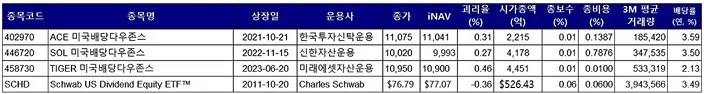 Dow Jones U.S. Dividend 100 Price Return Index 추종 ETF 알아보기(SCHD, TIGER, SOL, ACE)