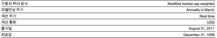 - 투자가능성. Dow Jones Dividend 100 지수가 다른 배당전략과 차별화되는 점은 엄격한 규모 및 유동성 심사와 수정시가총액 접근법을 기반으로 하는 가중 방식입니다. 규모 및 유동성 심사는 규모가 작고 부실화된 종목이 포트폴리오에 미치는 영향을 줄여 유동성 있는 구성종목 바스켓을 만드는 데 도움이 될 수 있으며, 수정시가총액에 기반한 가중 방식은 지수 수용 능력을 극대화하는 데 도움이 됩니다.