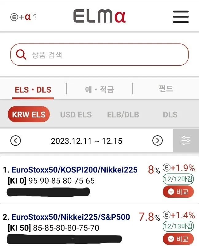 현재 판매 중인 ELS를 ELMA라는 앱에서 보여주고 있는 이미지입니다. 추후 ELMA라는 앱에 대해서도 포스팅 할 예정이며, 이미지 상에서 보이는 두 가지 상품에 대해 알아보도록 하겠습니다.