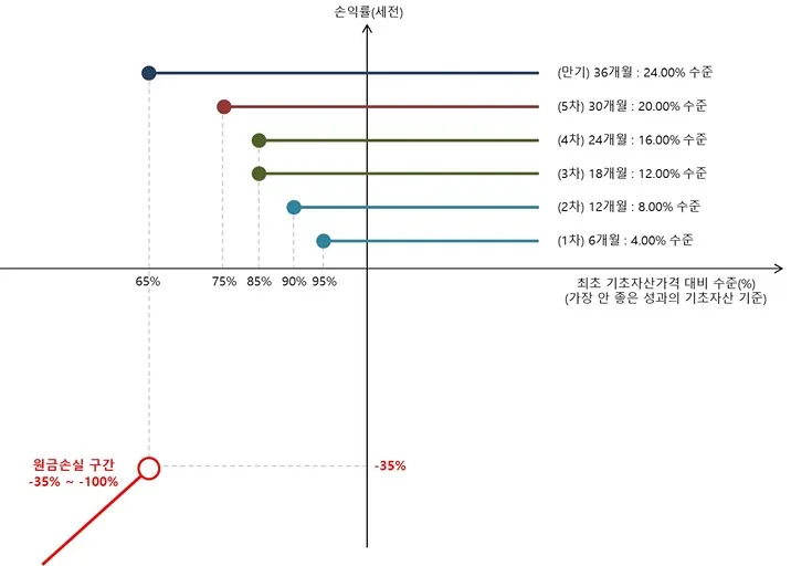 - 기초자산 중 하나라도 최초기초자산의 가격이 65 미만인 경우 : 원금손실(기초자산중 가장 하락률이 큰 기초자산가격의 하락률만큼 원금손실)