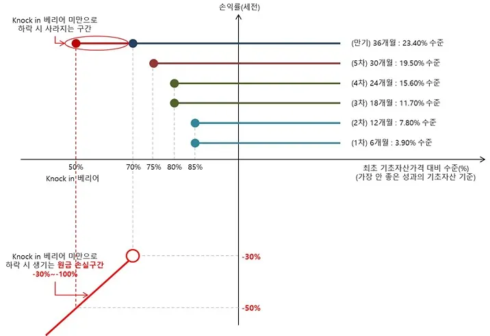 - 만기상환 시점에 수익상환 조건 미만이라면 가장 많이 하락한 기초자산의 하락률 기준으로 원금손실.