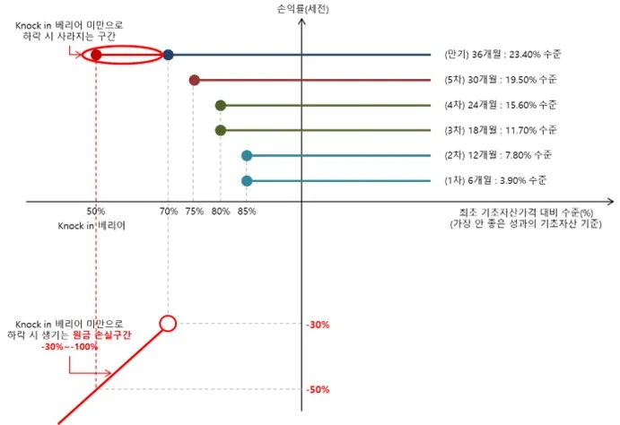 Knock in 조건의 개념과 No Knock in 상품과의 차이 은행 및 증권사에서 ELS를 가입하려 할 때, 가장 범용적으로 접할 수 있는 구조는 바로 스텝다운이라는 구조입니다. 앞서 포스팅하였던 “ELS란 무엇