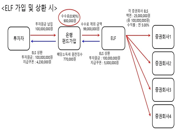ELF는 Equity Linked Fund의 약자로 투자자가 은행에서 ELF라는 투자상품을 가입하는 것입니다. ELF에 가입하면 Fund의 자산운용사가 펀드에서 ELS 편입합니다. 이 때에도 ELT와 마찬가지로 투자자는 은행에 수수료를 지급합니다. 수수료는 보통 투자원금의 0.60%에서 0.90% 수준입니다. 또한 펀드를 가입하는 것이기 때문에 투자신탁보수를 지불합니다. 은행의 수수료와 투자신탁보수도 위에서 설명한 것과 같이 ELS를 매입하는 매입가격에 모두 포함되어 있으므로 투자자에게 제시되는 수익률에서 차감되는 방식이 아닙니다.