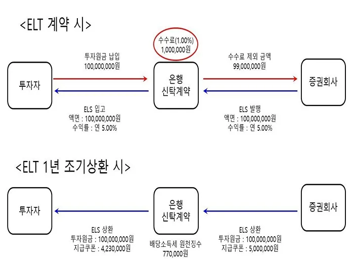 다시 한번 정리하자면, ELT는 은행에 수수료를 지불하고 ELS를 매입하는 신탁계약이며, ELS의 수익률은 세금만 원천 징수하면 되는 수익입니다.