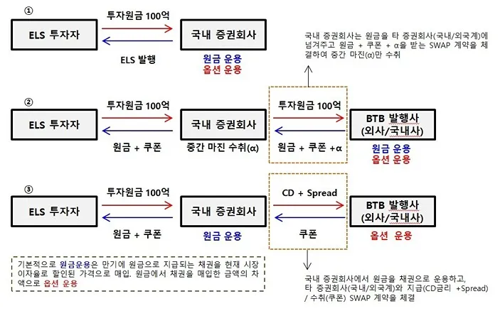 ②와 ③의 케이스는 ELS를 발행한 증권회사가 외국계 혹은 국내 증권회사와 Back to Back으로 운용의 일부 혹은 전부를 넘기는 방식입니다. 이때, ELS 발행회사가 원금까지 모두 넘긴다면, ②의 케이스이고, 원금은 ELS 발행회사가 운용하고 나머지 옵션운용 부분만 Back to Back 거래를 한다면 ③의 경우입니다.