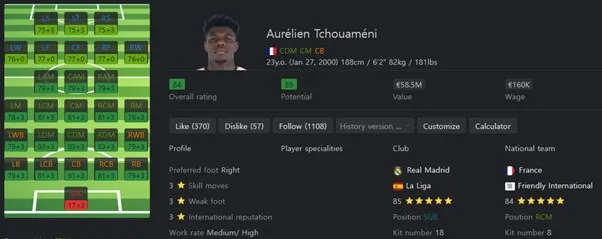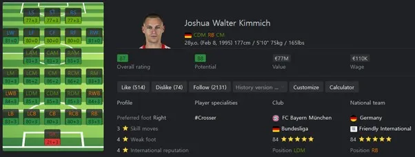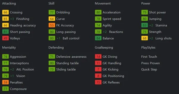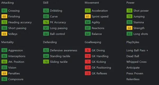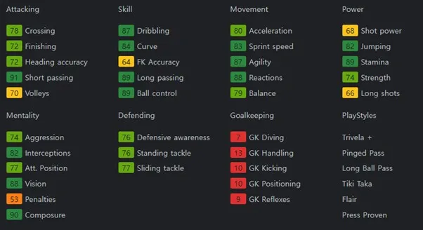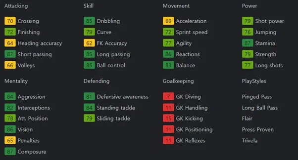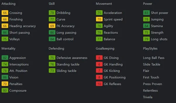 중원의 마에스트로 역할을 할 수 있는 선수입니다. 패스 정확도를 바탕으로 하는 높은 패스 성공률로 허를 찌르는 패스 플레이를 할 수 있습니다. 보유특성으로는 Trivela +, Pinged Pass, Long Ball Pass, Tiki Taka, Flair, Press Proven을 보유하고 있습니다.