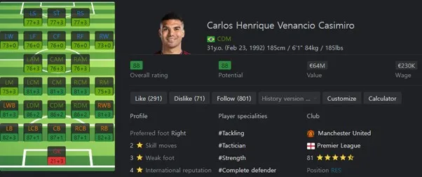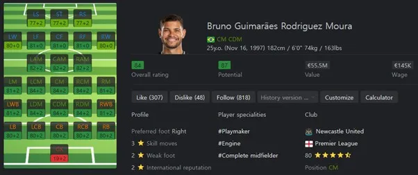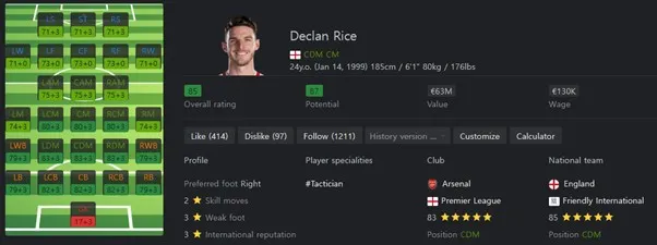 빌드업 능력이 좋은 중앙 미드필더입니다. 패스, 볼키핑 능력이 좋습니다. 선호 포지션은 CM 중앙미드 필더이지만 CDM에서도 뛰어난 성능을 보여줍니다. 보유특성으로는 Long Ball Pass, Slide Tackle, Flair, First Touch, Press Proven, Relentless, Trivela을 보유하고 있습니다.