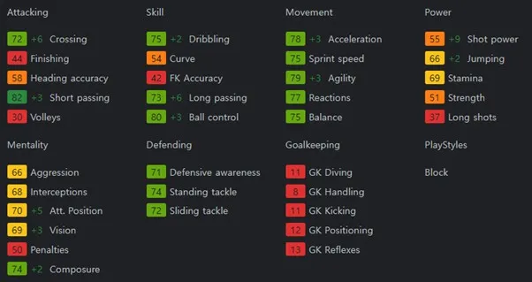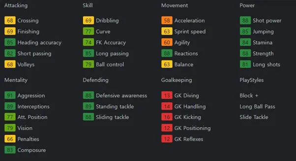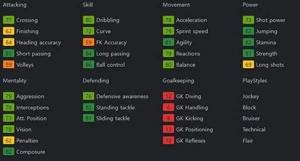볼 관리 능력이 뛰어나고, 정확한 패싱 능력을 보유하고 있습니다. 보유특성으로는 Jockey, Block, Bruiser, Technical, Flair을 보유하고 있습니다.