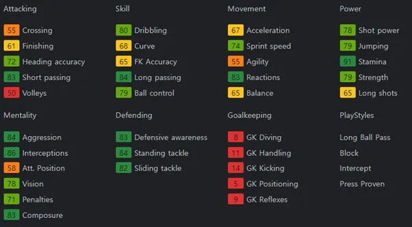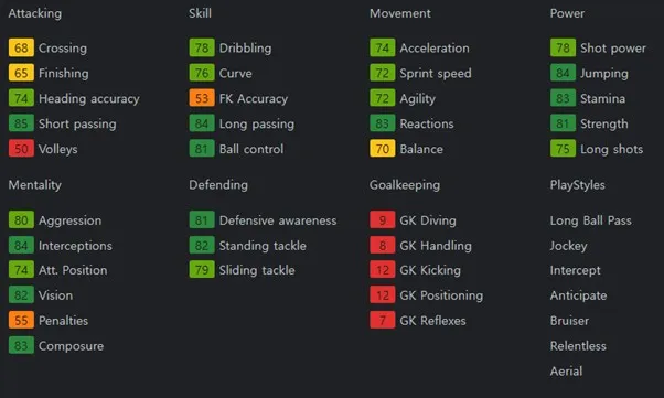 강력한 공중볼 장악 능력과 정밀한 패스 전개력을 갖춘 수비형 미드필더입니다. CDM으로 최상의 성능을 발휘하나 CM으로도 탑 클레스의 성능을 가지고 있습니다. 장신에 중원 수비력이 출중하고 볼 배급 능력을 갖춘 선수입니다. 보유특성은 Long Ball Pass, Jockey, Intercept, Anticipate, Bruiser, Relentless, Aerial을 보유하고 있습니다.