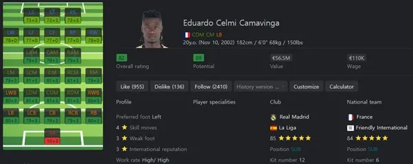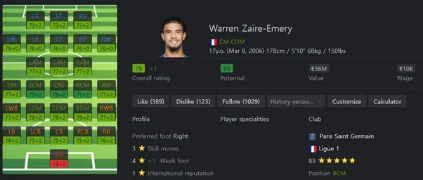 특급 유망주입니다. 가격도 저렴하기에 들고 시작하는 것도 나쁘지 않습니다. 많은 활동량을 가져가는 전혁적인 박스 투 박스형 미드필더입니다.공수 전반에 아주 높은 영향력을 행사할 수 있는 선수입니다. 보유특성으로는 First Touch, Press Proven, Quick Step을 보유하고 있습니다.