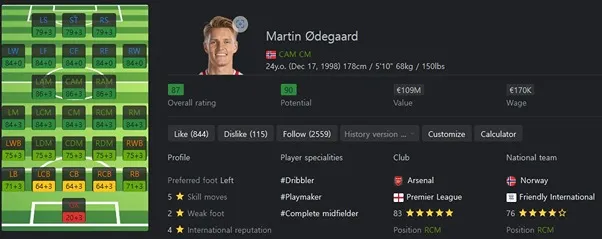 외데고르의 최대의 장점을 간결한 볼처리와 확실한 마무리 능력입니다. 날카로운 슈팅과 공간 침투 능력으로 골을 넣을 수 있는 선수입니다. 하지만 슈팅의 강도가 살짝 아쉽긴 하지만 정확도와 날카로움으로 승부를 볼 수 있습니다. 보유특성으로는 Pinged Pass +, Incisive Pass, Whipped Cross, Technical, air, First Touch, Trivela을 보유하고 있습니다.