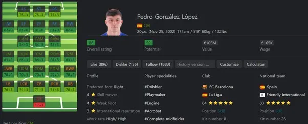 강한 전방 압박을 할 수 있는 선수입니다. 양발을 잘 쓰고 섬세한 볼 컨트롤 능력, 돌파력, 패싱력, 슈팅력을 겸비해 CM 뿐만 아니라 측면 공격수로도 뛰어난 성능을 보여주는 선수입니다. 활용가능성이 매우 많은 선수입니다. 보유특성으로는 Tiki Taka, Slide Tackle, Rapid, Relentless를 보유하고 있습니다.