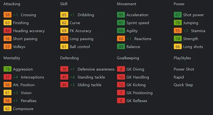 플레이스타일은 파워 슛(Power Shot), 래피드(Rapid), 퀵 스탭(Quick Step)을 보유하고 있으며, 이 중에서 퀵스탭(Quick Step), 래피드(Rapid)는 윙어 및 공격수 1티어 플레이스타일입니다. 갖춰야 할 것은 거의 다 갖추었다고 볼 수 있습니다. 플레이스타일에 대한 자세한 정보는 아래 링크를 참고하면 됩니다.