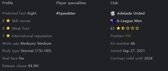 주발은 오른발이며, 개인기는 3성, 약발은 3성으로 준수합니다. 간략한 선수정보는 아래와 같습니다. 이적료도 매우 저렴하여 €4.3M으로 85까지 성장가능한 선수로서 가성비 최고의 선수라고 자부할 수 있습니다.