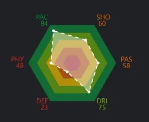 주발은 오른발이며, 개인기는 4성, 약발은 3성으로 준수합니다. 간략한 선수정보는 아래와 같습니다. 이적료도 매우 저렴하여 €2.7M으로 87까지 성장가능한 선수로서 가성비 최고의 선수라고 자부할 수 있습니다.