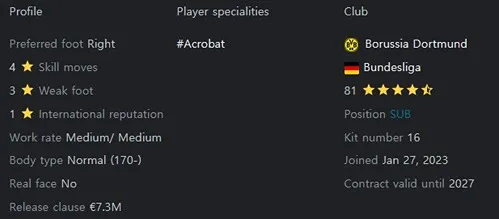 쥘리엥 뒤랑빌(Julien Duranville)은 벨기에 국적을 가지고 있으며, 안더레흐트 유스 출신으로 16세에 프로에 데뷔하여 6경기 출전을 하여 골을 넣었으며, 2023년 겨울 이적 시장에서 도르트문트에 입단하였습니다. 도르트문트에서 데뷔전을 치르던 당시 현란한 드리블 돌파를 감행하여 팀을 파상공세로 이끌어 주목을 끌었습니다. 이로 인해 도르트문트는 쥘리엥 뒤랑빌(Julien Duranville)이라는 보물 같은 재능을 가진 선수를 가지고 되었습니다. 현실에서도 이렇게 재능에 대한 기대를 한 몸에 받고 있는 선수인 만큼 FC24에서도 그 재능이 성장 잠재력 21이라는 수치로 구현되었습니다.