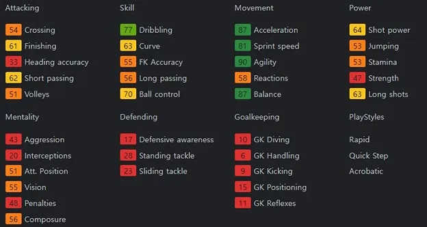 플레이스타일은 퀵스탭(Quick Step), 래피드(Rapid), 아크로바틱(Acrobatic)을 보유하고 있으며, 이 중에서 퀵스탭(Quick Step), 래피드(Rapid)는 윙어 및 공격수 1티어 플레이스타일입니다. 갖춰야 할 것은 거의 다 갖추었다고 볼 수 있습니다. 플레이스타일에 대한 자세한 정보는 아래 링크를 참고하면 됩니다.