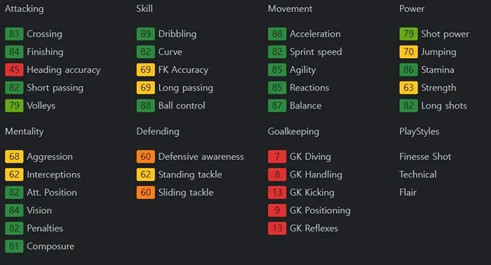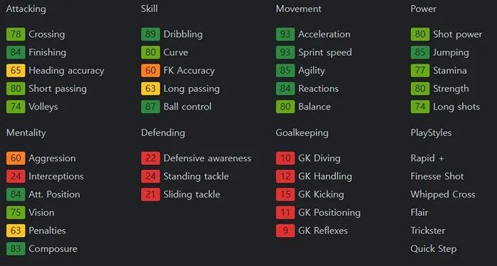 스피드가 빠른 데다가 잔발을 활용한 속도와 방향 변환으로 수비수들을 제치는 선수입니다. 그리고 이를 기반으로 한 드리블도 위협적입니다. 힘과 벨런스가 좋아서 포스트플레이에도 능합니다. 또한 시야도 넓어 어시스트 능력도 갖추었습니다. 보유특성은 Finesse Shot +, Chip Shot, Rapid, Trivela을 보유하고 있습니다.