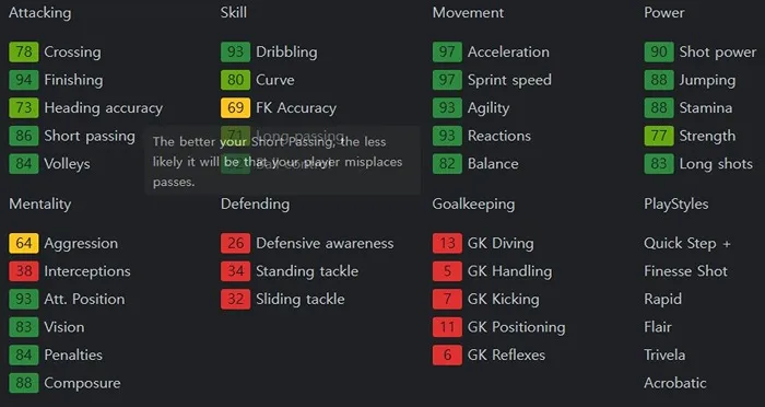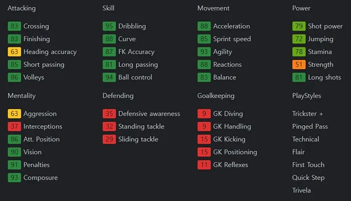 피지컬은 약하지만 개인기 하나로 모든 걸 커버하는 선수입니다. 특히나 중앙에서 공격을 풀어나가는 스타일이라면, 네이마르의 개인기는 더욱더 빛을 발휘하게 됩니다. 보유 특성으로는 Trickster +, Pinged Pass, Technical, Flair, First Touch, Quick Step, Trivela을 보유하고 있습니다.