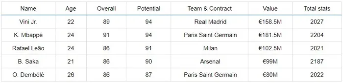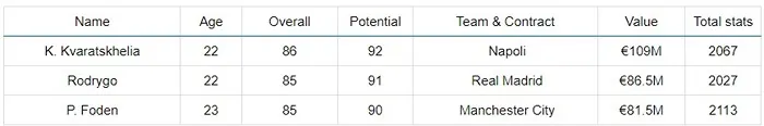 이 밖에도 흐비차 크바라츠헬리아, 로드리고 실바, 필 포덴 등의 선수가 있으나, 윙어 포지션에서는 재 성능을 100% 발휘하지 못하고, 다른 Best position 이 있기에 번 외로 소개하도록 하겠습니다.