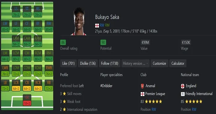 아스널 오른쪽 측면 라인의 파괴자이자 실질적인 해결사입니다. 기술을 바탕으로 한 일대일 돌파 능력이 뛰어납니다. 또한 양 발을 자유자재로 쓰기 때문에 크로스나 슈팅에 있어서 템포가 빠릅니다. Best Position은 RW로 현존 RW 중에서는 최강이라 할 수 있습니다. 특성으로는 Finesse Shot, Technical, Flair을 보유하고 있으나, 속도 관련 특성의 부재로 속가 측면에서는 앞서 소개한 윙어보다는 다소 밀리는 느낌입니다.
