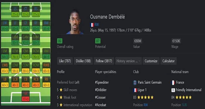 밀란에서 왼쪽 윙어로 포지션을 확립한 뒤에 스피드와 득점력을 살린 선수입니다. 압도적인 속도와 가속력으로 수비수를 제치는 탑 윙어입니다. Best position 역시 LW입니다. 특성으로는 Rapid +, Finesse Shot, Whipped Cross, Flair, Trickster, Quick Step를 보유하고 있습니다.