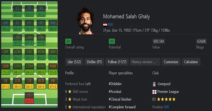 현란한 드리블로 상대 수비 라인을 흔들어 놓고 변칙적인 양 발 킥으로 많은 공격포인트를 생산할 수 있는 선수입니다. Best Position은 RW이며, 특성은 Rapid +, Flair, Trickster, Quick Step을 보유하고 있습니다.