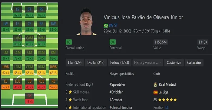 세계 최고의 LW입니다. 어마어마한 스피드는 원래 유명했고, 수비 타이밍을 빼앗는 방향 전환과 완급 조절, 문전의 좁은 공간을 뚫어내고 골로 가는 길을 여는 능력을 발휘하는 월드클래스 선수입니다. 특성은 Quick Step +, Finesse Shot, Chip Shot, Rapid, Flair, First Touch, Trivela을 보유하고 있습니다. 총 7종으로 공격수 특성 종합세트입니다. Best position 역시 LW입니다.