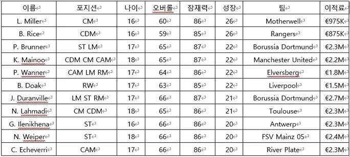 선정의 기준은 잠재력이 최소 85이상이며, 성장 가능한 오버롤이 10이상되는 선수입니다.