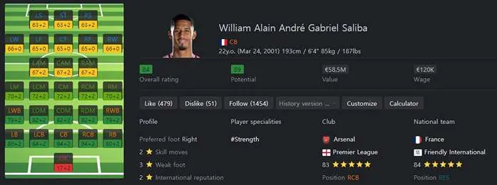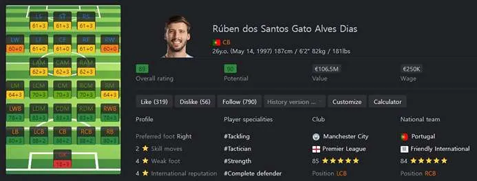 피지컬과 스킬 모든 것을 갖춘 완벽한 센터백입니다. 강력한 피지컬을 바탕으로 몸싸움과 제공권 싸움에서 좋습니다. 동시에 양발잡이로서 빌드업 능력과 공격의 출발점 역할을 제대로 할 수 있습니다. 보유특성은 Bruiser +, Power Header, Block을 가지고 있습니다. Jockey, Anticipate 이 두 특성이 없는 것이 조금 아쉬운 선수입니다.