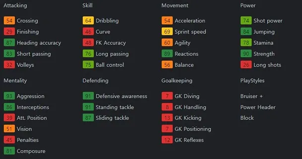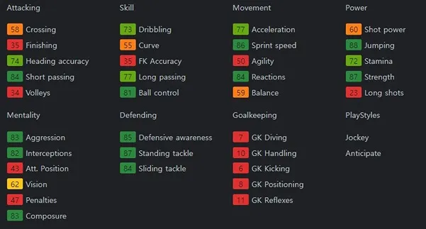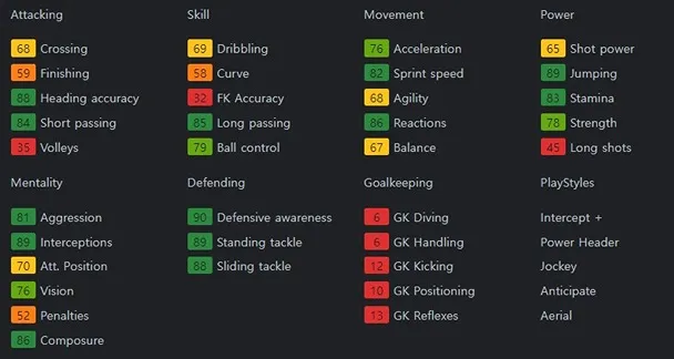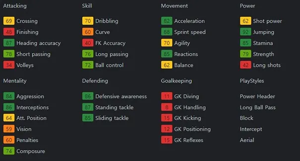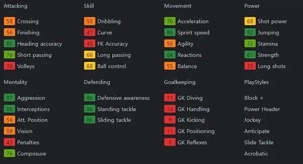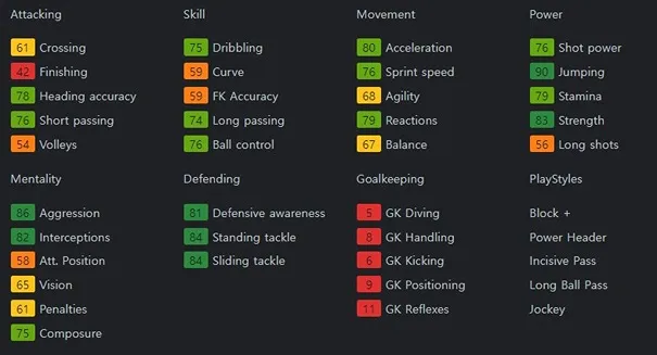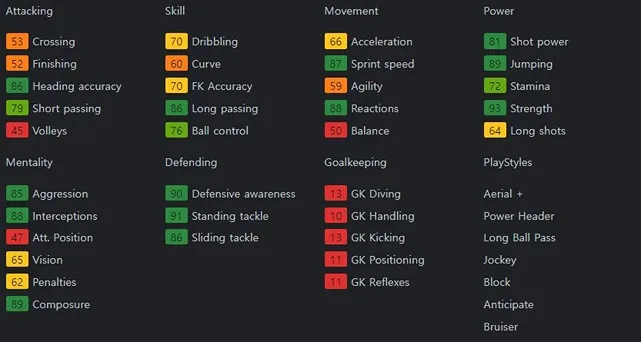 힘과 높이 속도와 기술을 모두 갖춘 선수입니다. 191츠의 키의 공중볼 처리 능력 및 과감하고 정확한 태클 기술로 수비력이 어마어마합니다. Block +, Power Header, Jockey, Anticipate, Slide Tackle, Acrobatic을 보유하고 있습니다. 즉 수비수가 가져야 할 모든 특성을 가지고 있습니다. 특히 Jockey, Anticipate 이 두 특성을 가지고 있는 수비수로서 엄청난 성능을 보여줍니다.