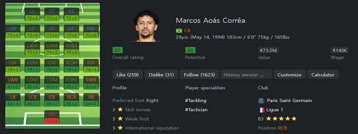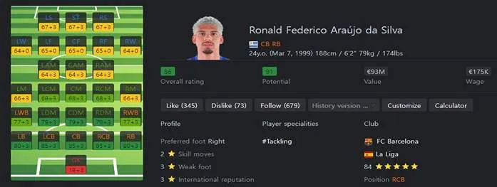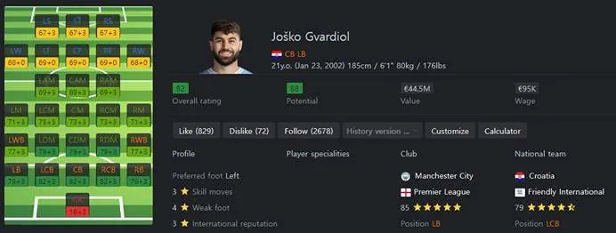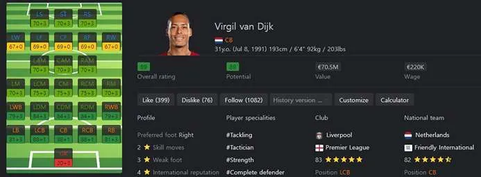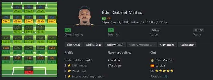 말이 필요 없는 선수입니다. 피지컬이 좋고 민첩성과 주력을 갖추고 있습니다. 뿐만 아니라 공격 가담 능력도 좋고 헤더능력도 좋습니다. 보유 특성으로는 Aerial +, Power Header, Long Ball Pass, Jockey, Block, Anticipate, Bruiser을 보유하고 있습니다. 필요한 모든 특성을 가지고 있다고 할 수 있습니다.