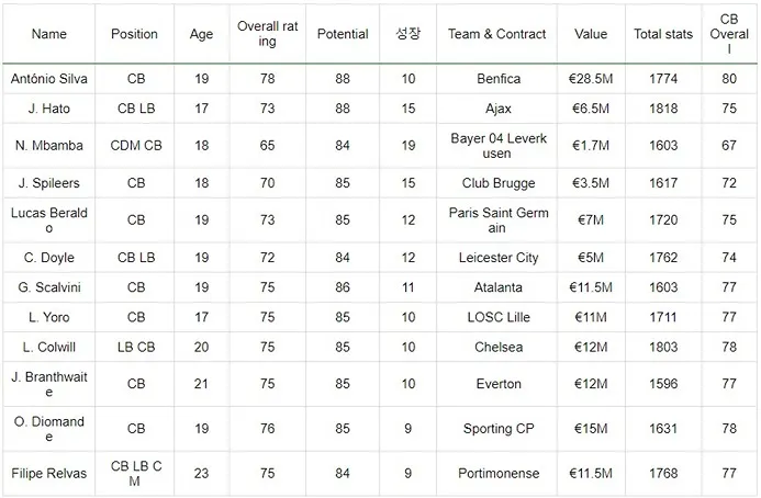 아래의 선수들은 큰 성장잠재력과 낮은 이적료로 팀의 재정적에 많은 도움을 줄 수 있는 선수입니다.
