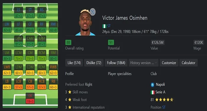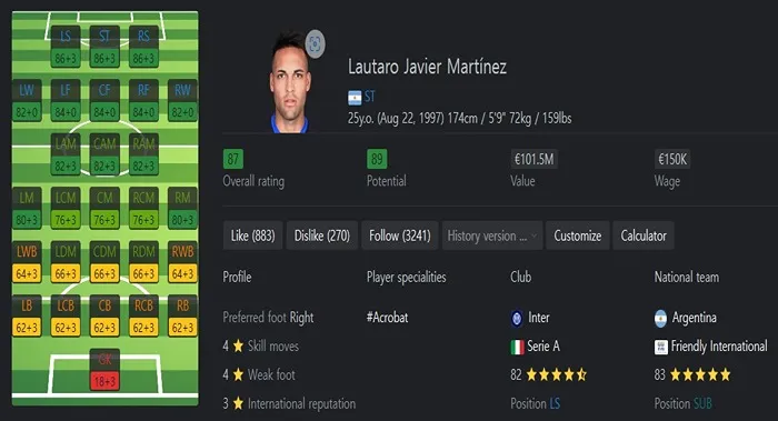 지난 시즌 세리에 21골 6도움 챔스 3골 3도움으로 커리어 하이 기록을 남겼습니다. 침투 성공률이 꽤나 높기 때문에 침투 유저라면 좋아할 만한 움직임을 보여준다. 특성은 Technical, Flair, Trivela를 가지고 있습니다.