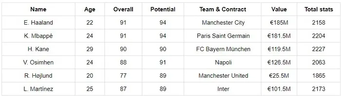 FC24 커리어모드의 ST Top 6에 대해 알아보겠습니다. 커리어 모드는 선수의 나이에 따라 오버롤이 변화하므로, 능력치가 좋지만 나이가 너무 많은 선수는 제외하였습니다.