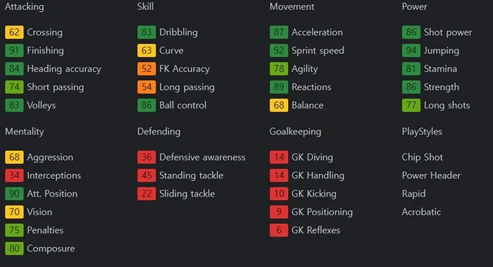 스트라이커로써 빠른 스피드를 이용해 마지막 패스를 받아 수비수 한 둘 정도 제치고 슈팅을 때리는 포쳐로써의 능력이 훌륭한 선수입니다. 특성은 Chip Shot, Power Header, Rapid, Acrobatic을 보유하고 있습니다.
