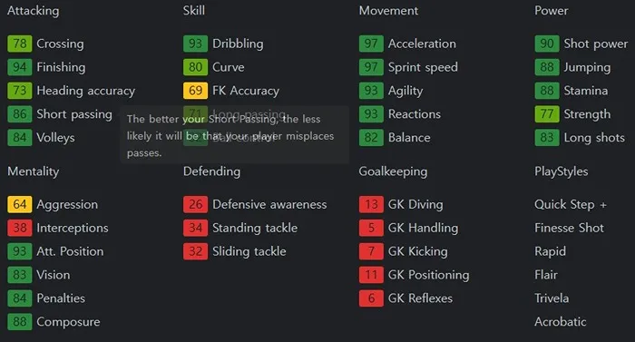 빠른 스피드로 상대 수비진을 파괴하고, 뛰어난 개인기와 몸싸움에서도 강하고 양발 슈팅에도 능하여 수비하기가 까다로운 선수입니다. 특성은 Quick Step +, Finesse Shot, Rapid, Flair, Trivela, Acrobatic을 보유하고 있습니다.