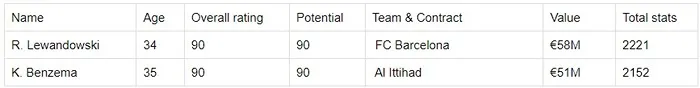 이 밖에도 레반도프스키, 카림 벤제마가 있습니다. 다만 커리어 모드는 나이가 들어감에 따라 능력치도 하향되기 때문에 제외하였으나, 저렴한 가격으로 몇 시즌 만을 사용할 경우라면, 사용해도 무방할 것 같으나 Value의 본격적인 하락이 있기 전에 이적시켜야 효율적인 구단운영을 할 수 있습니다.