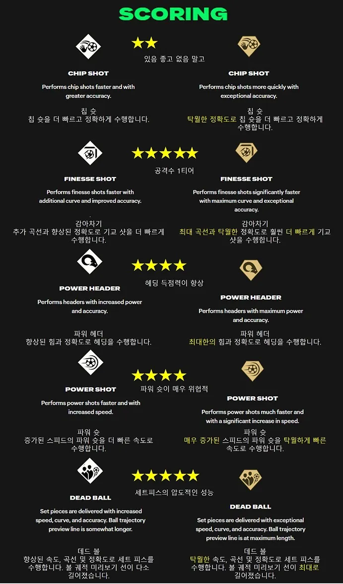 FC24 플레이스타일+(특성, 스킬) 총 정리하도록 하겠습니다. 각 플레이스타일의 한글 및 영문 설명 그리고 포지션 별 티어 순위와 사용감과 성능까지 모두 정리하겠습니다. 플레이스타일(특성, 스킬)은 크게 6개의 파트로 분류되고 34개의 종류가 있습니다. 6개의 파트는 스코어, 패스, 볼 컨트롤, 수비, 피지컬, 골키퍼 특성입니다. 그리고 각 특성마다 실버와 골드(+) 아이콘으로 단계가 나눠져 있고, 당연히 실버보다는 골드 특성이 성능이 좋습니다. 하지만 실버든 골드든 본인의 플레이 스타일에 맞거나 1티어 특성을 보유하고 있는 선수가 있다면 영입할 때 우선적으로 고려해야 할 정도로 오버롤(Overall) 점수보다도 더욱 좋은 성능을 발휘합니다.